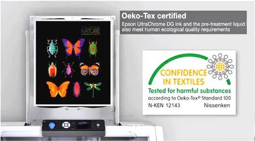 第三:安全可靠:愛普生活的色彩DG涂料墨水通過了Oeko-tex Standard 100的第一級(jí)別認(rèn)證(Report no.N-KEN12143),可以用來制作嬰兒及倆歲以下兒童服裝的織物,原材料和附件,令經(jīng)營者可以放心的生產(chǎn),令最終用戶可以安心的使用。