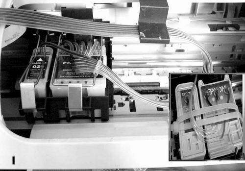 2.我們對連續(xù)供墨應有一個辯證的認識。①連續(xù)供墨系統(tǒng)本身不是一個有獨立功能的產品,它必須得安裝在打印機上才能發(fā)揮其作用,打印機也不會因為安裝了連續(xù)供墨而性能更好、打印精度更高。②目前,打印機更新?lián)Q代也快,型號也多,所以目前連續(xù)供墨還是手工作坊式的組裝,在接頭、插件等部位難免會有疏漏,造成裝有墨水的連續(xù)供墨產品在長途運輸后的銷售中,一次開箱的產品合格率相對不高;③連續(xù)供墨的套件從自身上講并不是十全十美了,還有一個不斷改進、不斷適應的過程;④如果說使用原裝墨盒就不會出現(xiàn)問題,那打印機廠家為何還要那么多的維修中心?使用連續(xù)供墨后,還是會出現(xiàn)一些新的情況,在處理一些問題時會增大處理上的難度,比如,使用中打印機卡紙,原來可以打開面蓋慢慢地將紙張拉出來,但是連續(xù)供墨后上面有排管橫穿,紙張拉出過程中就更要小心。⑤打印量本身就少,比如兩個月使用不完一套墨盒的用戶不提倡使用連續(xù)供墨系統(tǒng),可以采用無綿填充墨盒手工加墨(圖9)。
