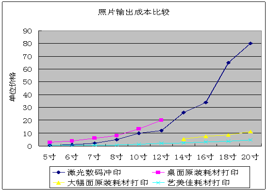 從上圖就可以看出,照片打印機和基于照片打印的多功能打印機,每年都以30%以上的速度增長,僅美國市場,2005年預計裝機量就達到2000萬臺以上,2008年可達3000多萬臺。 相比于數(shù)碼激光,照片的噴墨打印輸出至少有如下優(yōu)勢:方便、隨意性強:因為完全在家庭、辦公室實現(xiàn),可大可小、可多可少,隨時隨地、隨心所欲。私密性好:用不著將數(shù)碼文件交給別人,也用不著從他人處取回,不想讓人見的,別人永遠見不到。DIY,樂趣無窮:不管是對于專業(yè)人士,還是對于數(shù)碼發(fā)燒友,完全可以陶醉于從拍照、編輯修改到打印輸出的無窮樂趣。環(huán)保:不再用銀鹽等稀缺資源,也擺脫了藥水使用與排放對于環(huán)境的污染。持久不退色:噴墨打印墨水分為染料和顏料兩大類,如果使用顏料墨水打印出的照片,比傳統(tǒng)的銀鹽感光照片能夠保存更長的時間而不退色。 噴墨打印技術不斷發(fā)展,墨水和打印介質(zhì)品質(zhì)也在不斷提高,從技術的角度來看,水性顏料墨水+RC間隙型防水高光相紙是照片噴墨的主流方向。不但質(zhì)感、影像品質(zhì)方面毫不遜色于銀鹽感光照片,而且在光線耐牢度、方便性、設備投入等方面明顯優(yōu)于感光照片。 可能唯一的問題是成本,有的人會抱怨,噴墨打印的成本高,是的,以EPSON照片級噴墨打印機,打印在原裝EPSON高質(zhì)量光澤照片紙上為例,打印一張6寸的照片,成本會在3元以上,而在外面的沖印店里,激光數(shù)碼沖印的報價只有一塊左右。定位于專業(yè)應用的大幅面打印機打?。?4英寸到44英寸寬)成本會低很多,因為桌面打印機墨盒中的墨水,平均每毫升價值10塊人民幣左右,大幅面打印機墨盒的容量更大,平均每毫升2元上下。從下圖就可以看出,用專業(yè)大幅面打印機打印照片,成本就已經(jīng)遠遠低于激光數(shù)碼沖印的價格,但是這些打印機并不是給家庭使用的,像激光數(shù)碼沖印一樣,是給專業(yè)的影像服務機構使用的。
